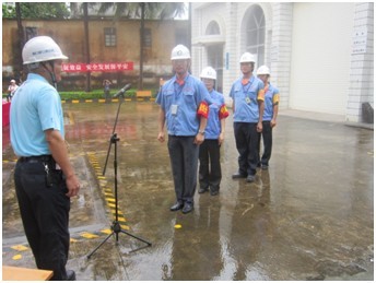 演練以模擬2012年6月19日上午9:00,我司米鋪水廠加氯車間突然發(fā)出“嗚、嗚”的漏氯報警聲,且車間檢測儀表顯示氯庫濃度為4ppm,現(xiàn)場漏氯吸收裝置已經(jīng)啟動、氯庫大門正在自動關(guān)閉,噴淋系統(tǒng)開始運行,現(xiàn)場風(fēng)向為西南風(fēng)這一情形為背景而展開。