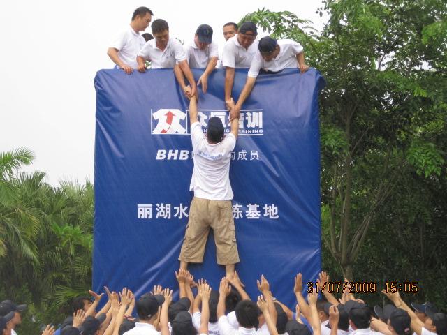所有隊(duì)員在不借助外力的情況下,攀登上4.2米高的一面墻。