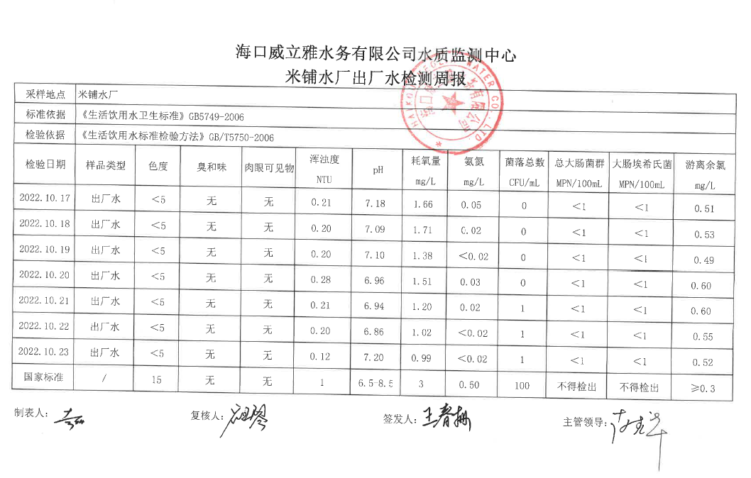 2022年10月米鋪水廠出廠水檢測(cè)周報(bào)(10.17-10.23)