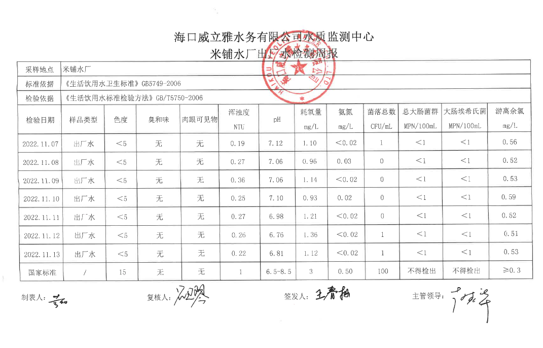 2022年11月米鋪水廠出廠水檢測(cè)周報(bào)(11.7-11.13)