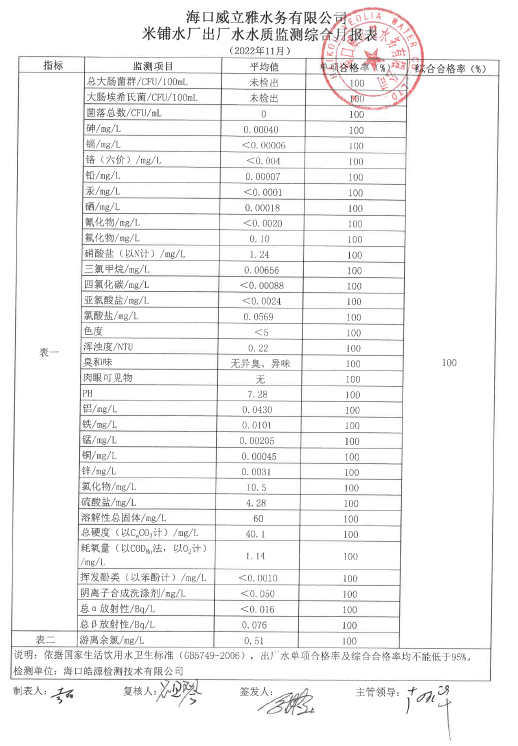2022年11月??谕⒀潘畡?wù)有限公司米鋪水廠出廠水水質(zhì)監(jiān)測(cè)月報(bào)