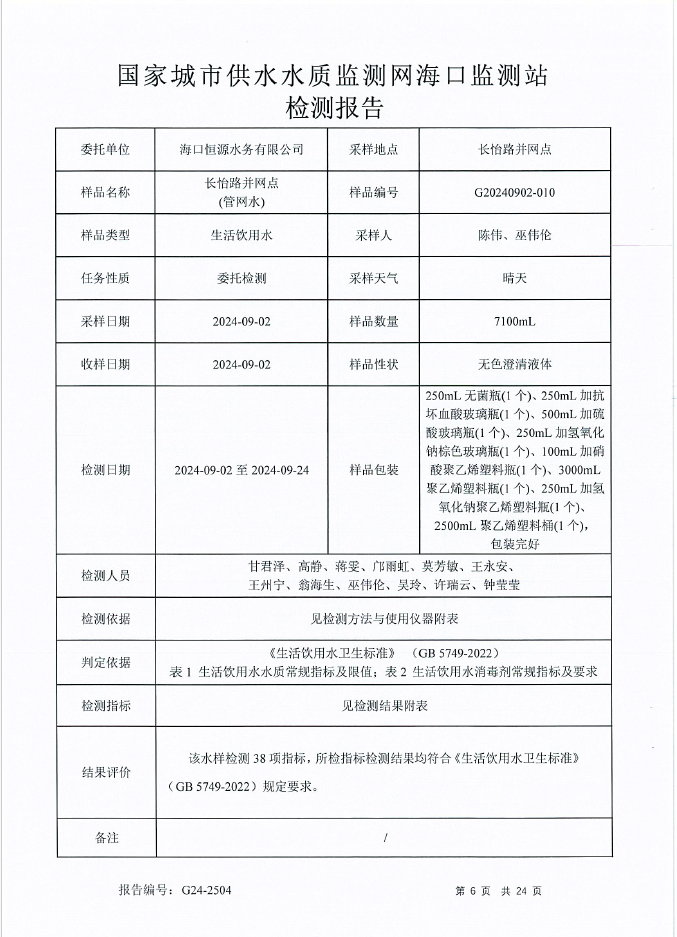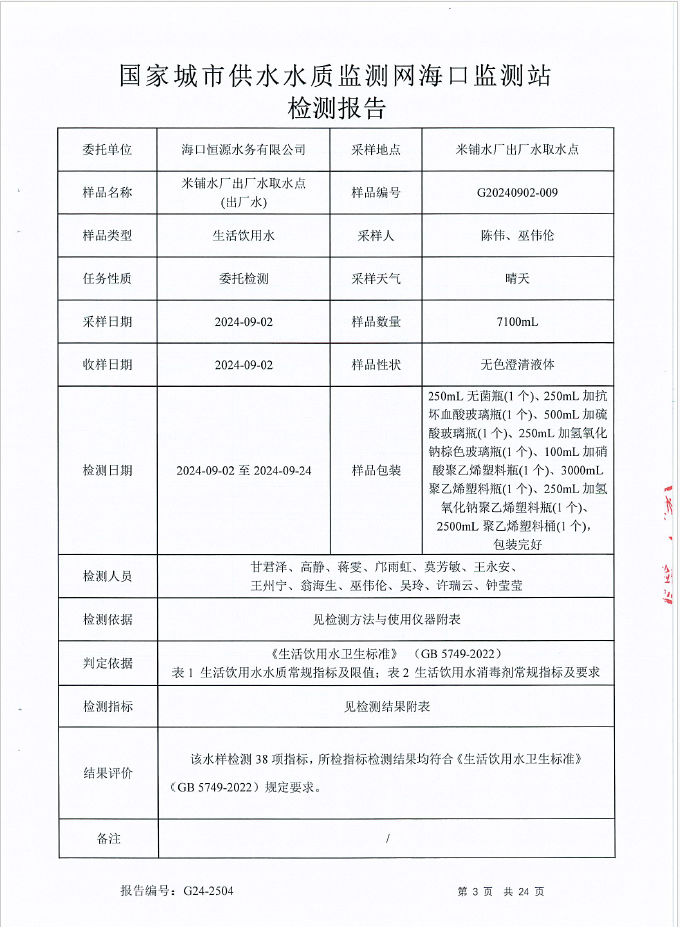 2024年9月恒源水務(wù)有限公司米鋪水廠出廠水、管網(wǎng)水月檢報(bào)告