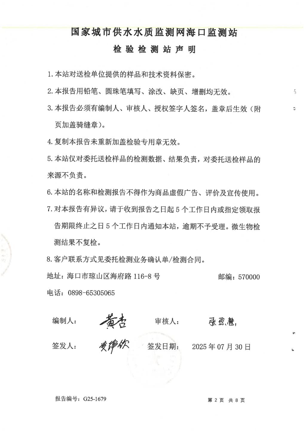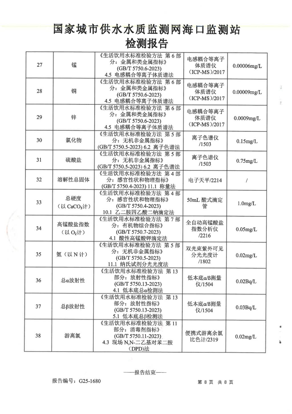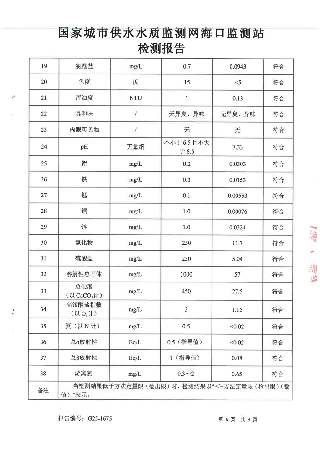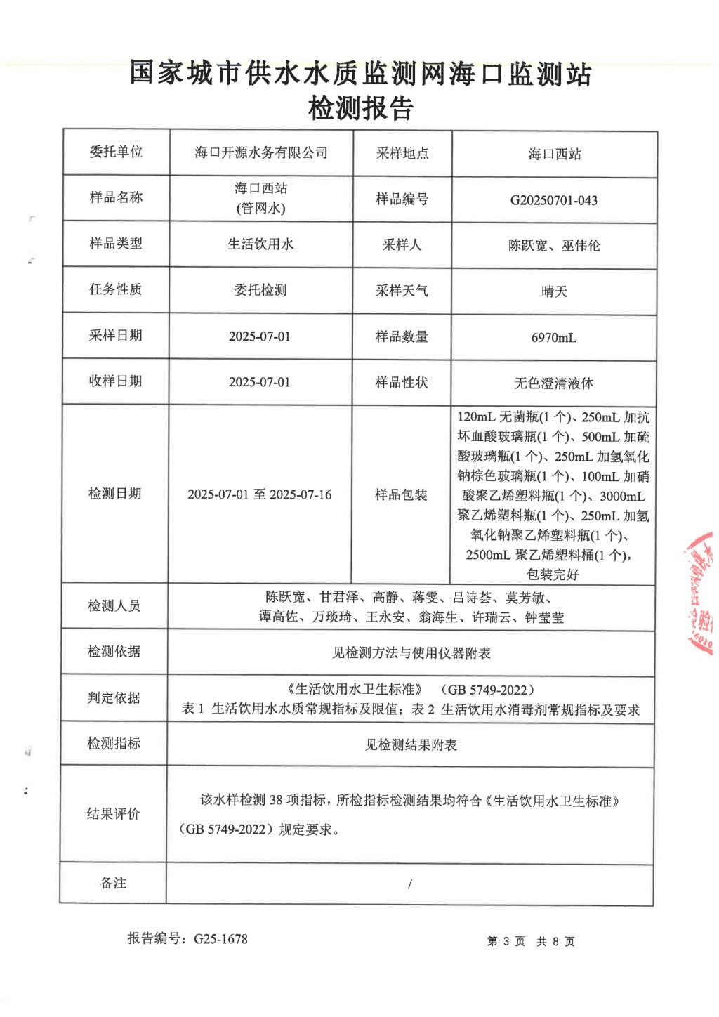 2025年7月開源水務(wù)有限公司米鋪水廠出廠水、管網(wǎng)水月檢報告