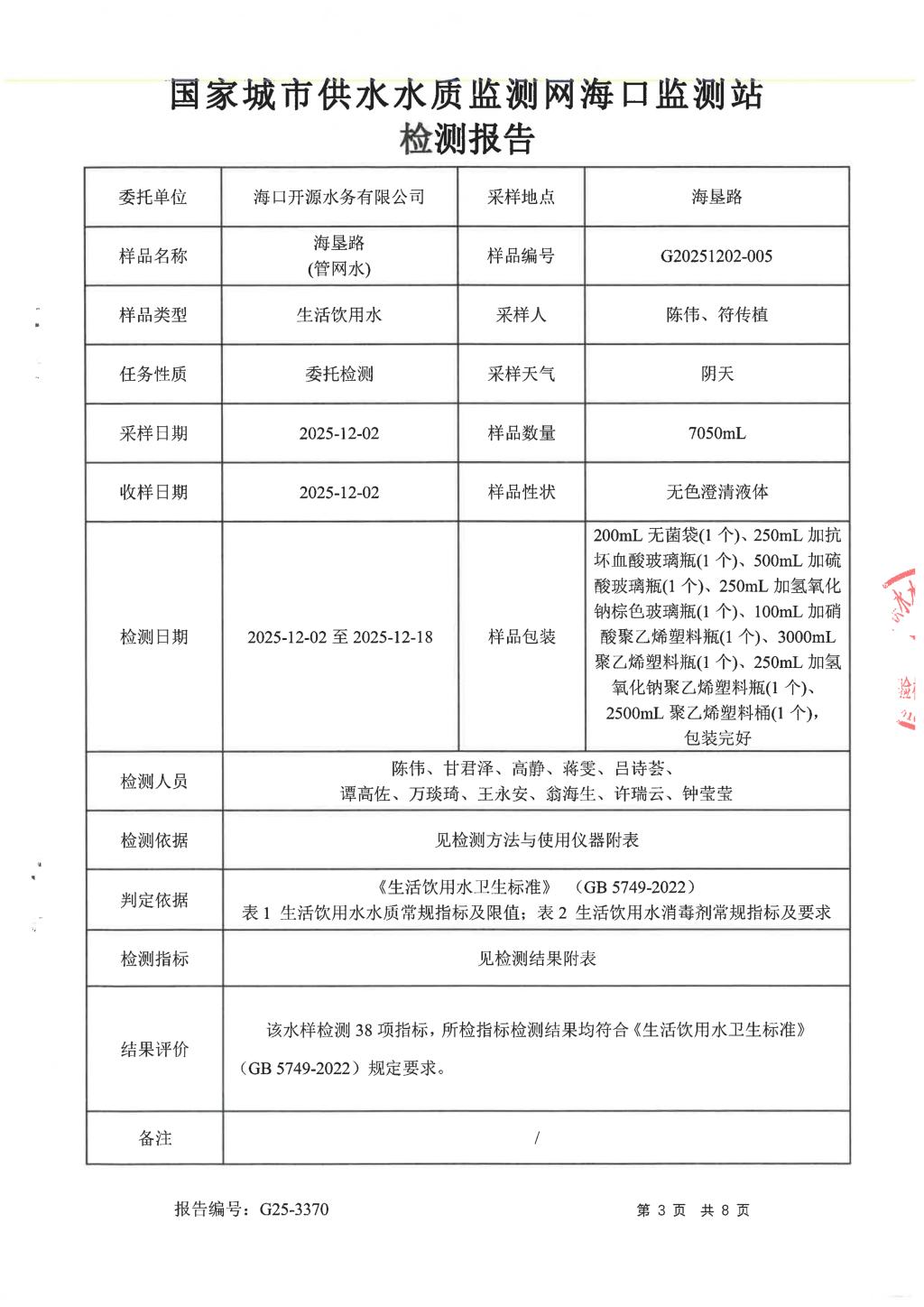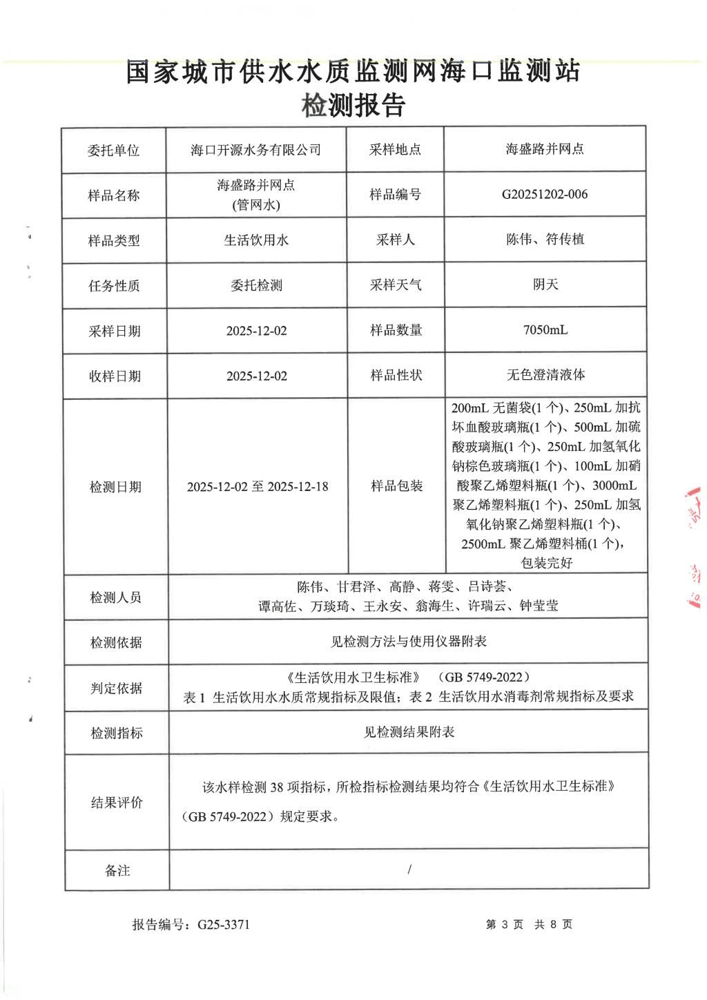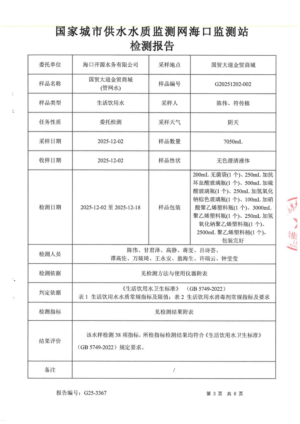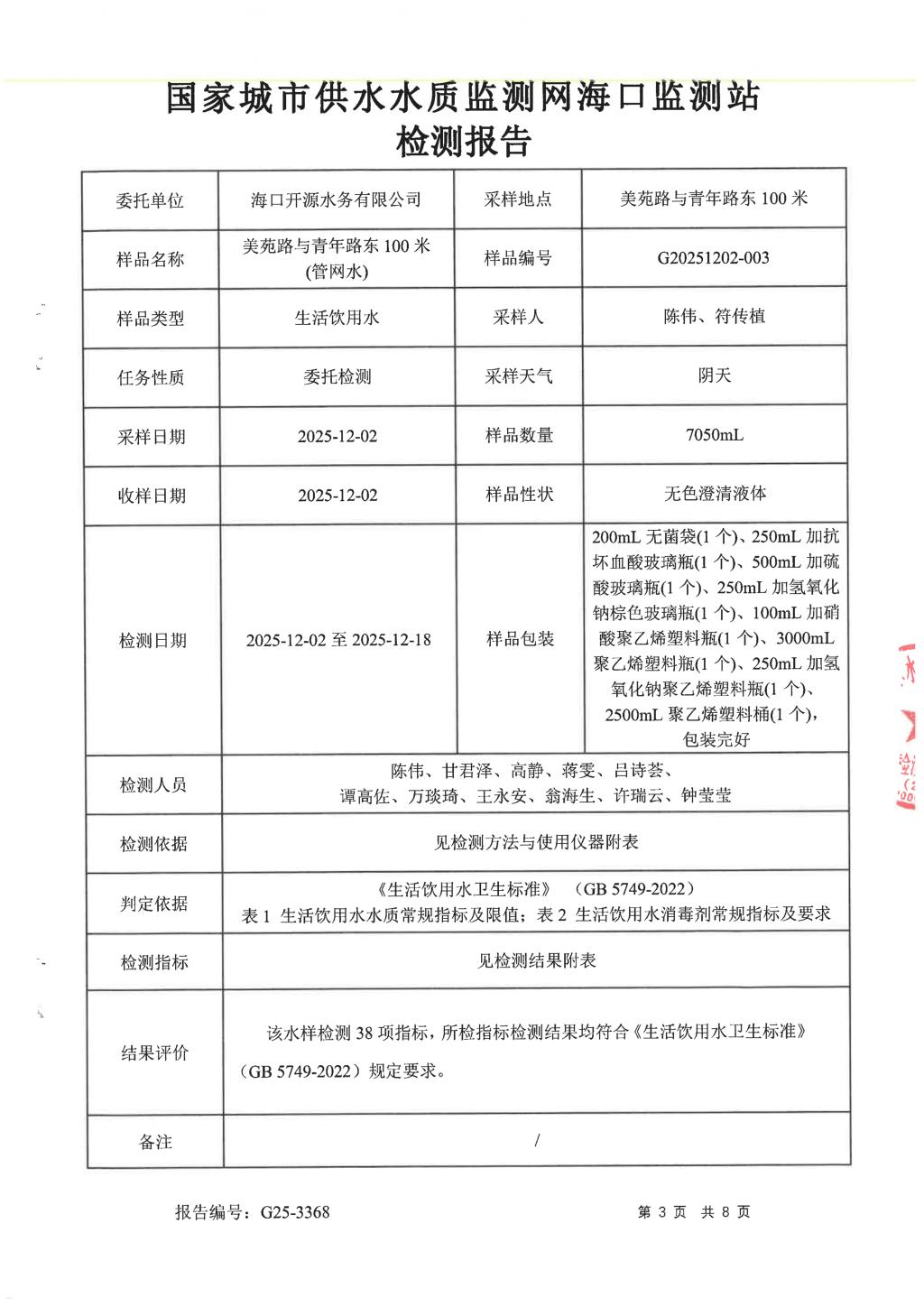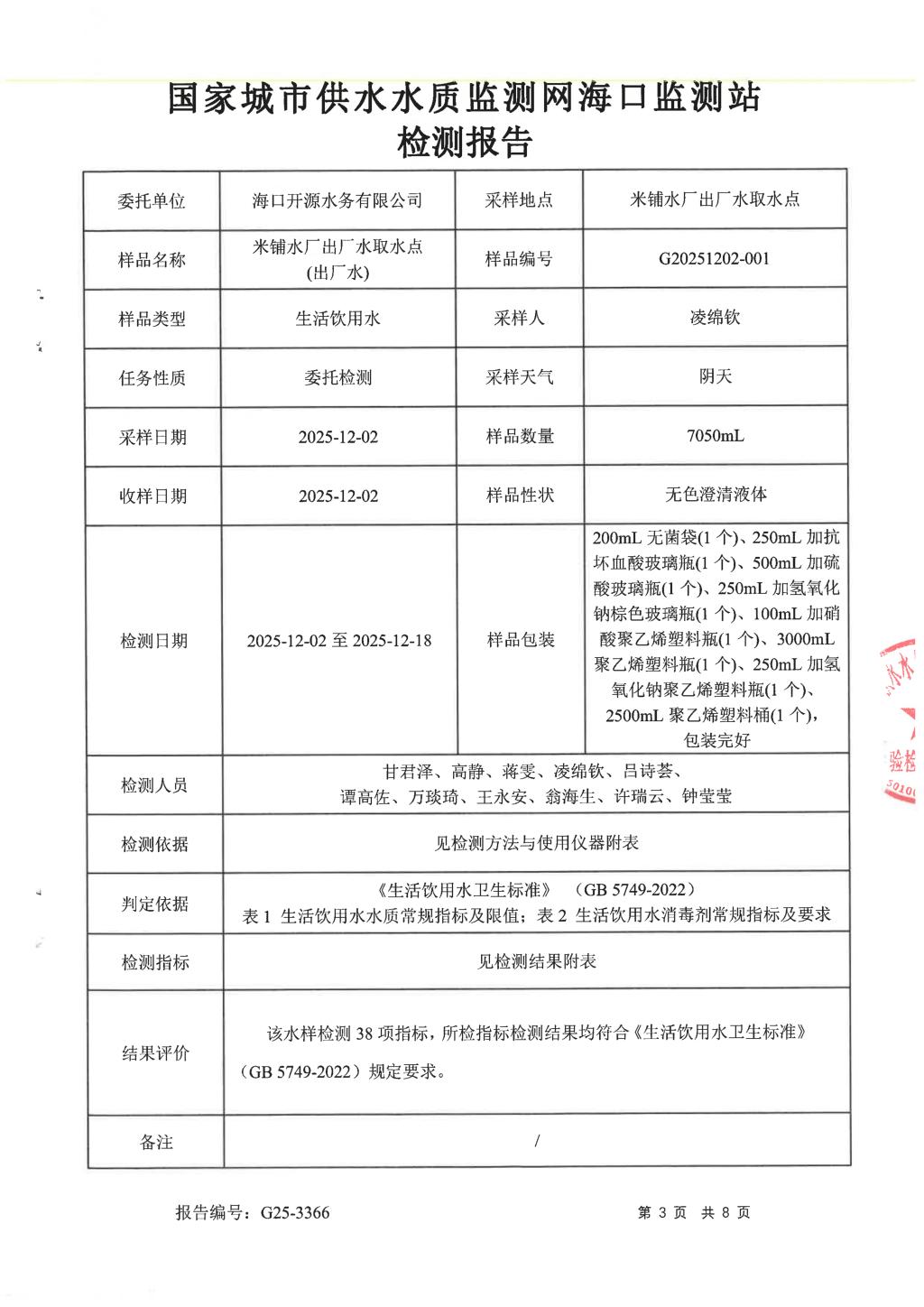 2025年12月開源水務(wù)有限公司米鋪水廠出廠水、管網(wǎng)水月檢報告